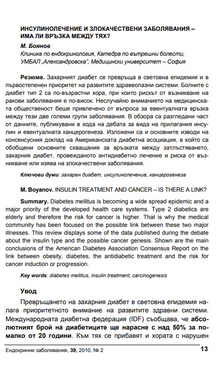 Инсулинолечение и злокачествени заболявания - има ли връзка между тях? - Ендокринни заболявания, 39, 2010, № 2, 13-23.